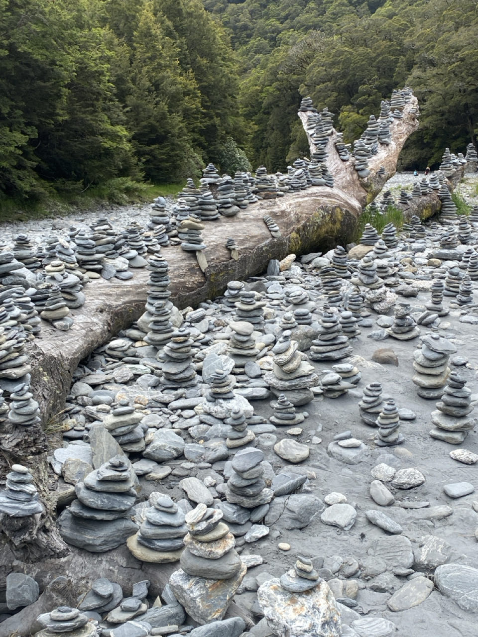 Op een volgende plek is een andere waterval te zien. Deze is minder spectaculair, maar daar hebben heel veel mensenkinderen zich uitgeleefd op het maken van een stapeltje steentjes.