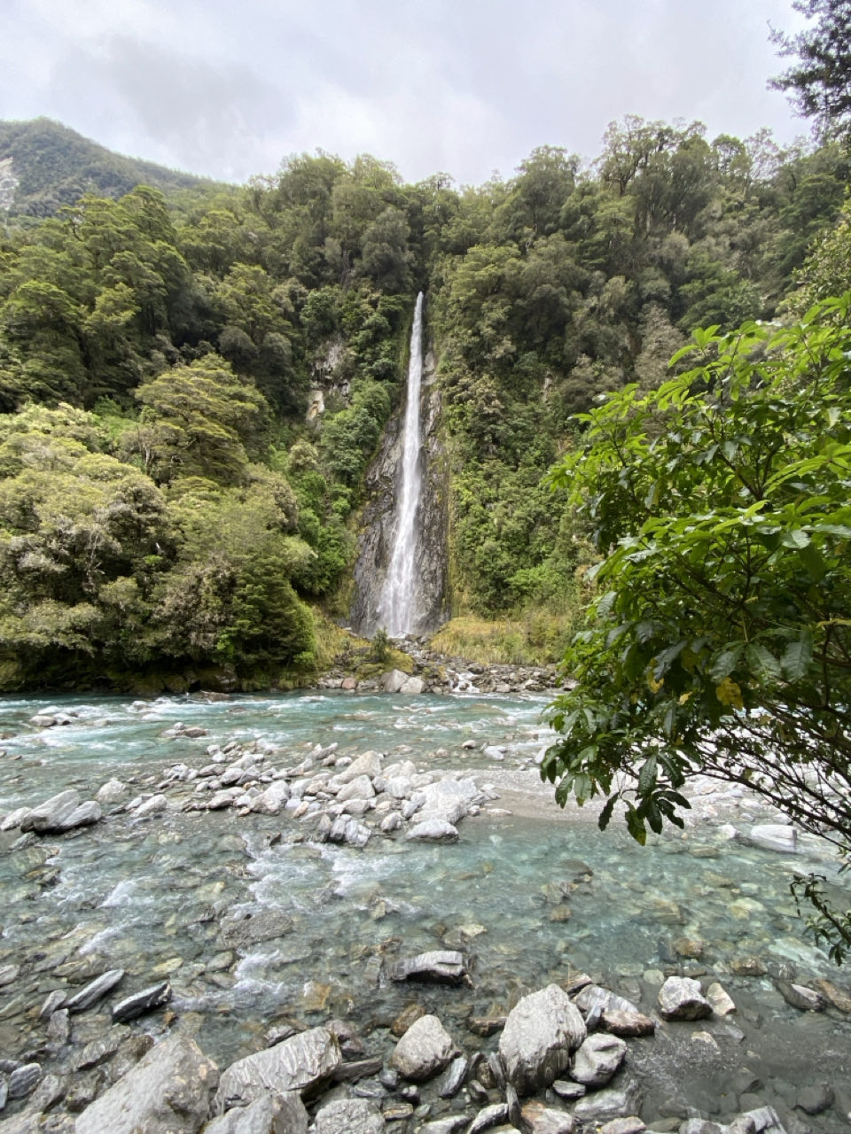 Volgende stop is Thunder Creek Falls, een waterval die zich 28 meter loodrecht in de Haast River stort. Grappig is de dode boom die ligt in de rivierbedding.