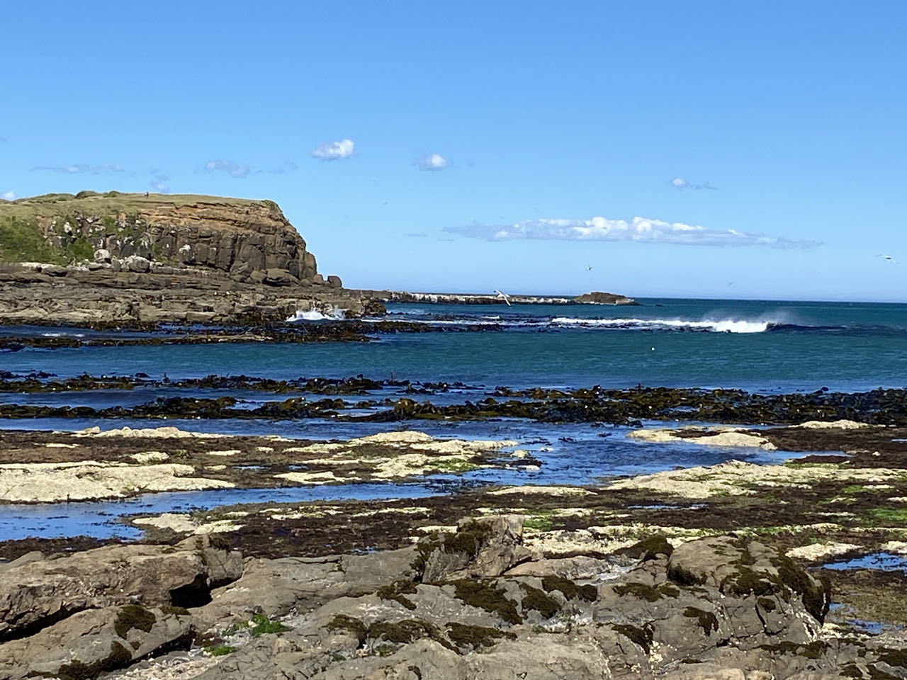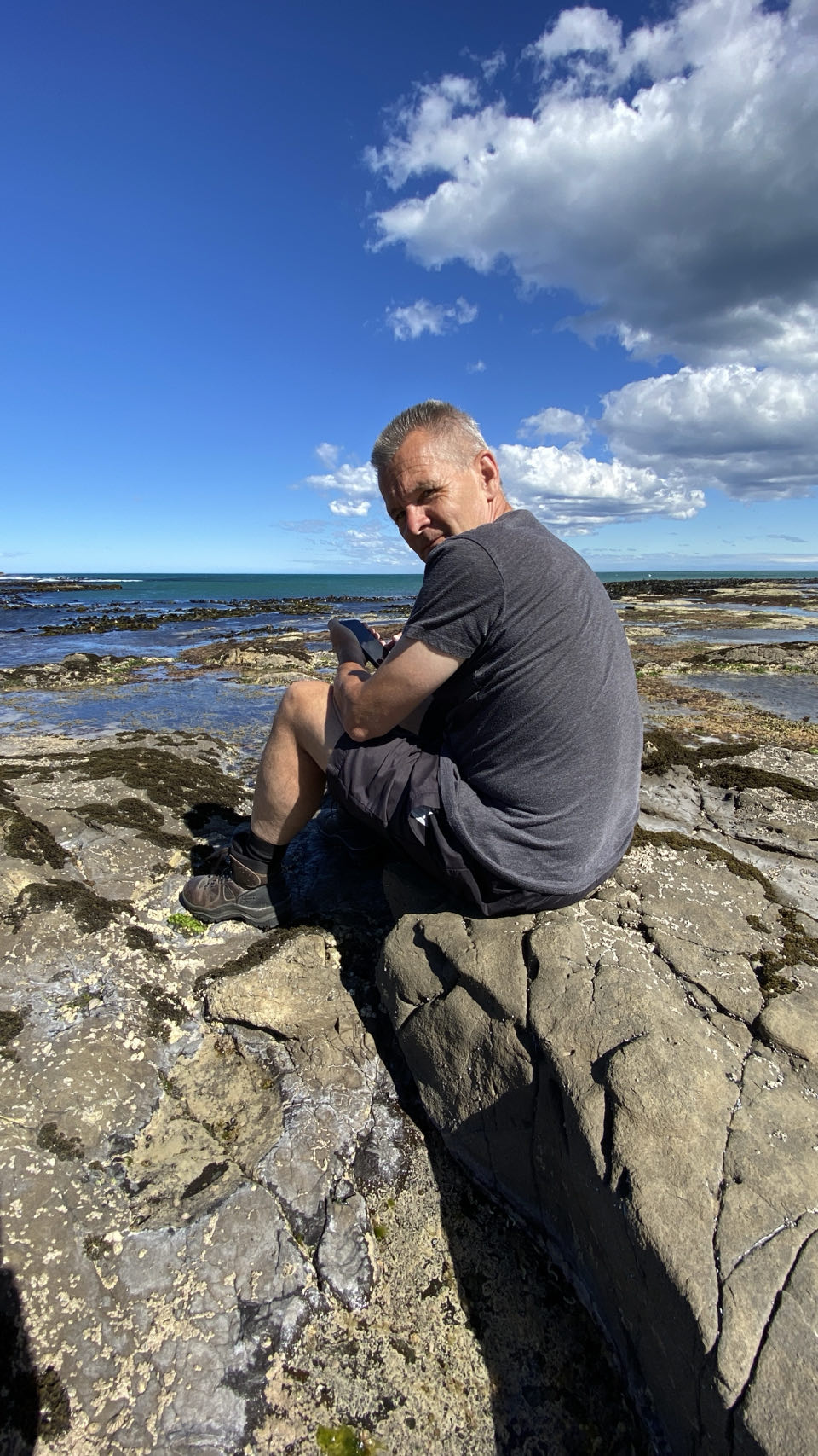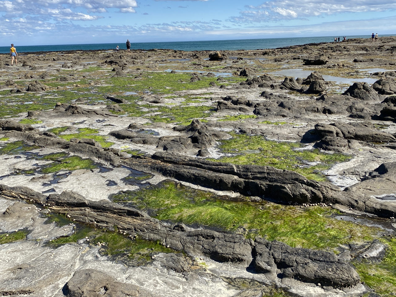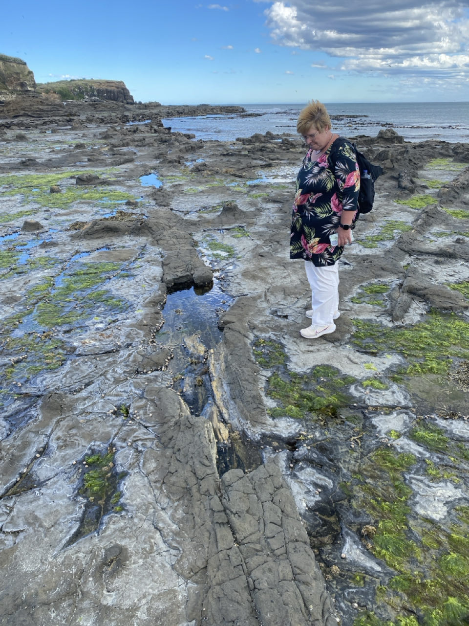 Ons motel ligt in Waikawa, vanaf de tweede verdieping kijken we op een inham van de zee. Bij aankomst is het eb en staat het droog. Daarna rijden we een stukje terug naar Curio Bay. Bij eb is hier een versteend bos te zien van 170 miljoen jaar oud. Versteende bossen zijn redelijk zeldzaam omdat hout snel vergaat. Na vulkaanuitbarstingen is het bos echter overstroomd door water met siliciumdioxyde, wat binnen een paar maanden voor verstening zorgde. Je kunt de vorm van een aantal boomstammen en de basis van bomen nog herkennen, soms met de ringen er nog in.
