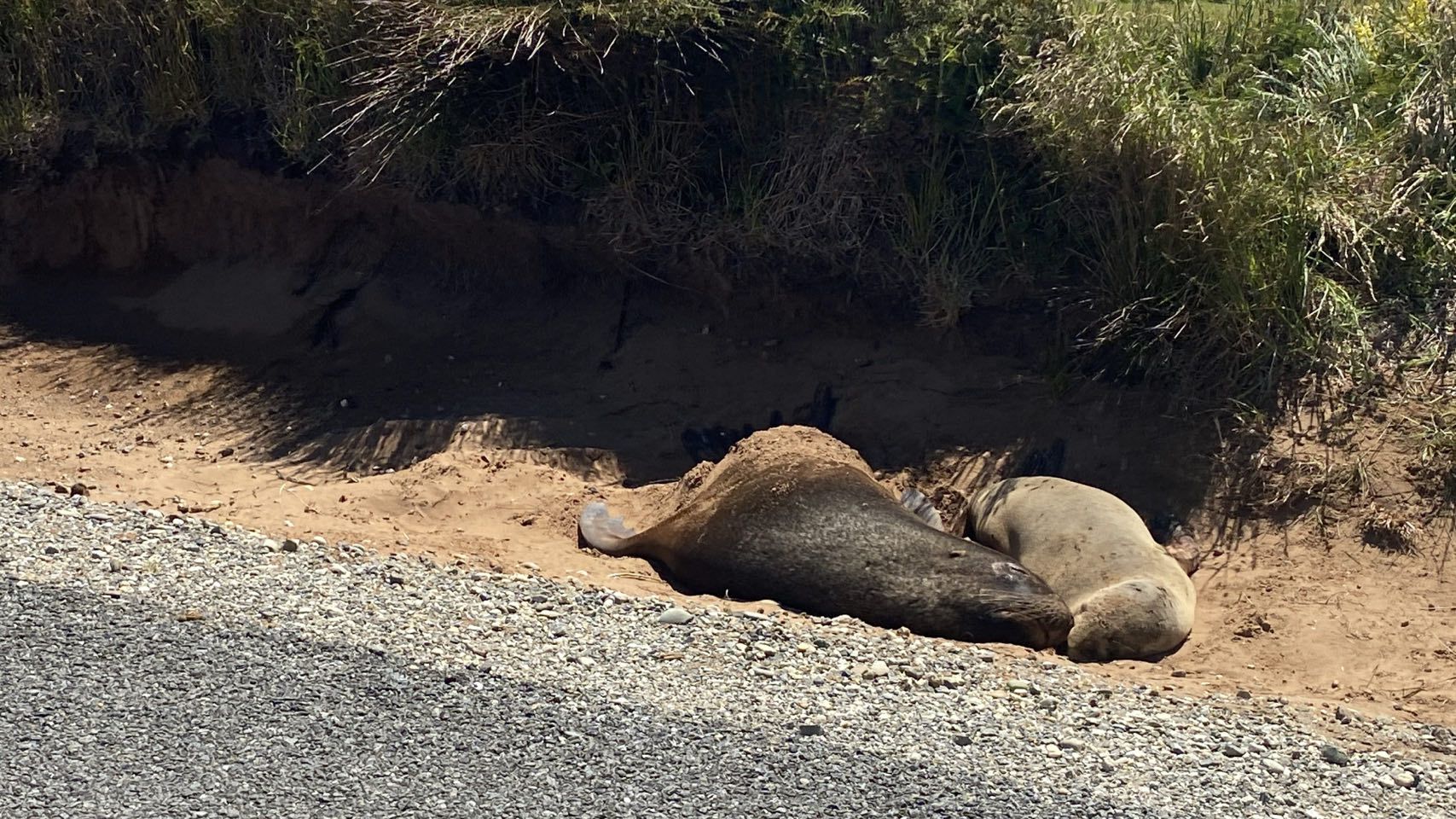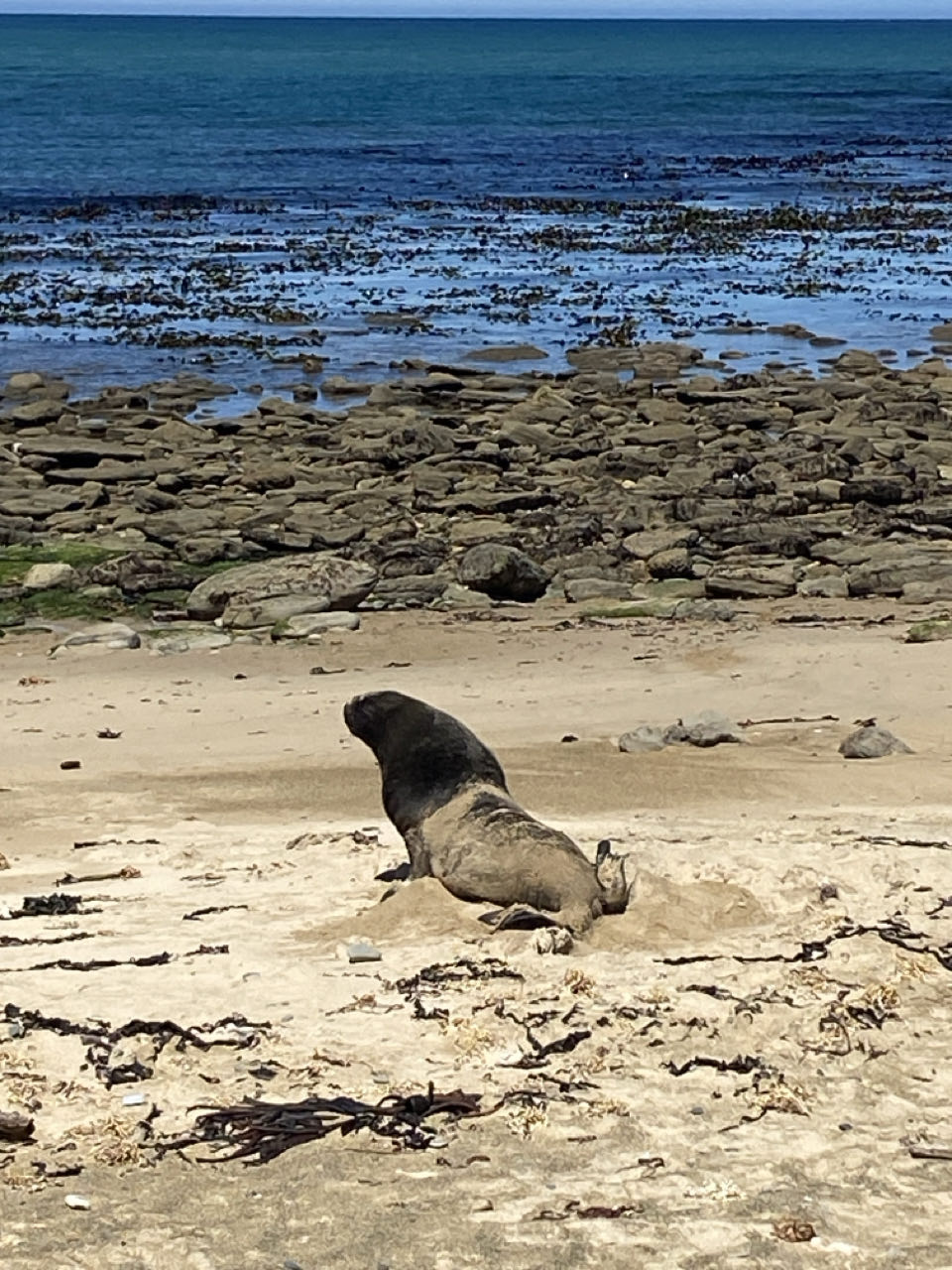 Veel rijden vandaag. In Invercargill stoppen we voor de farmers market, maar ook hier gaat het om een stuk of vijftien verkopers en een live zanger. Tien minuten later stappen we alweer in de auto. We rijden door naar Waipapa Point in het zuiden van Nieuw-Zeeland. Hier staat een kleine vuurtoren en is er kans op de aanwezigheid van zeeleeuwen, zeehonden en dolfijnen. We hebben geluk, er ligt een grote zeeleeuw op het strand. Op de terugweg zien we ook nog een zeehond met jong naast de weg liggen.