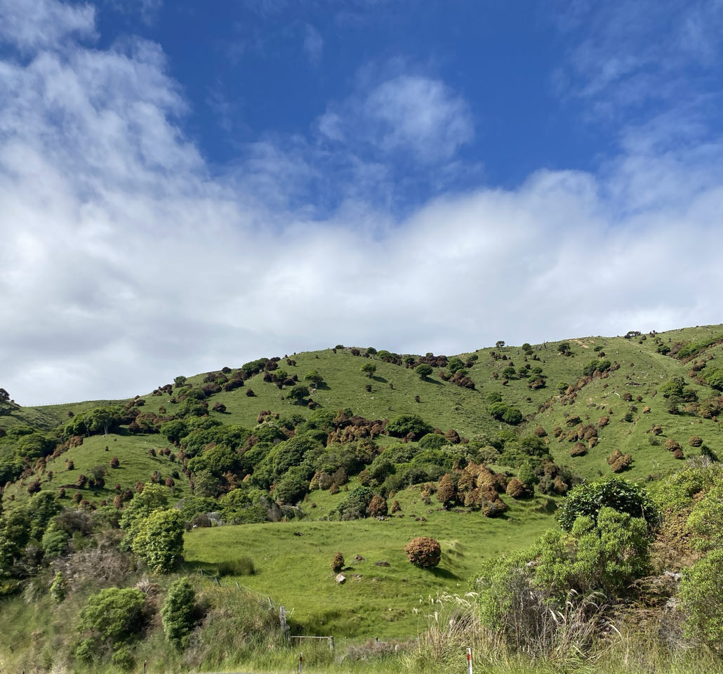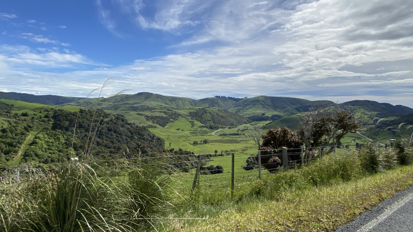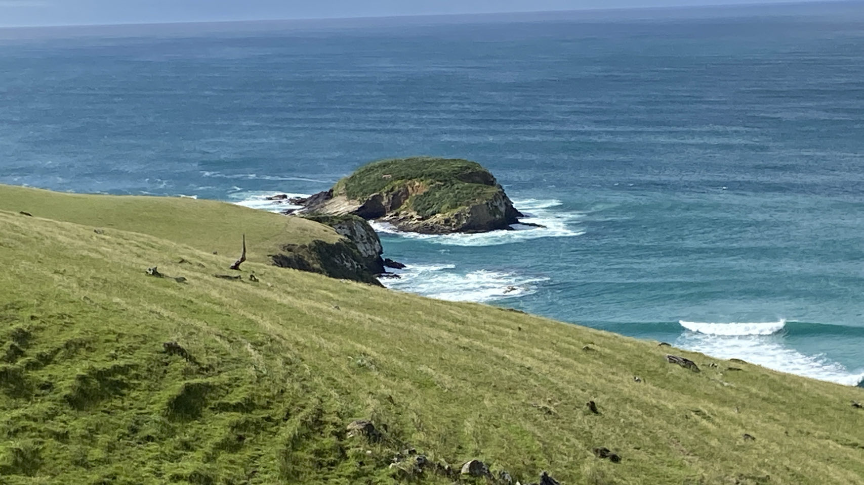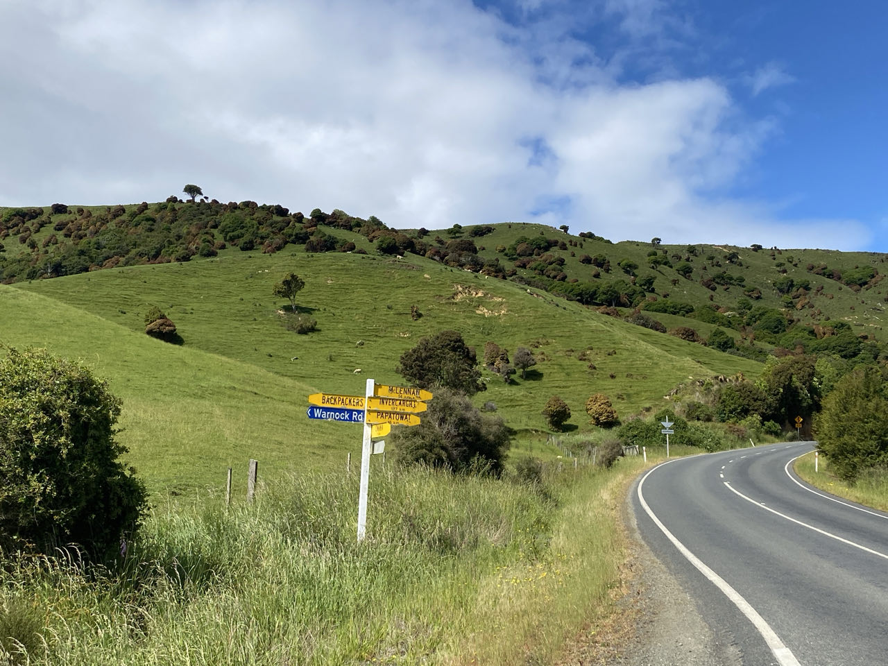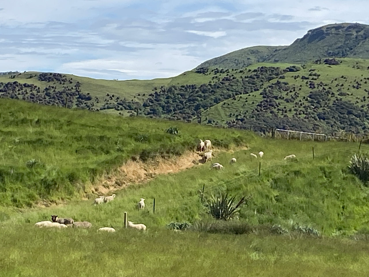 Genoten van het eerste deel van de autorit naar Dunedin door de Catlins. Wat is deze “southern scenic route” toch mooi. Landschappen in alle kleuren groen. We hadden ook geluk met de zon. Die scheen volop, waardoor het kleurenpalet mooi uitkwam. En het lentegras had voldoende regen gehad, zodat het nog zijn frisgroene uitstraling had. Met al die grazende plukken witte wol zag dat er mooi uit. Helaas was het meestal niet veilig om zomaar midden op de weg te stoppen volgens de chauffeur van dienst. Heb vaak uit een rijdende auto foto’s gemaakt. Sowieso is het lastig om wat je ziet mooi op de foto te krijgen.