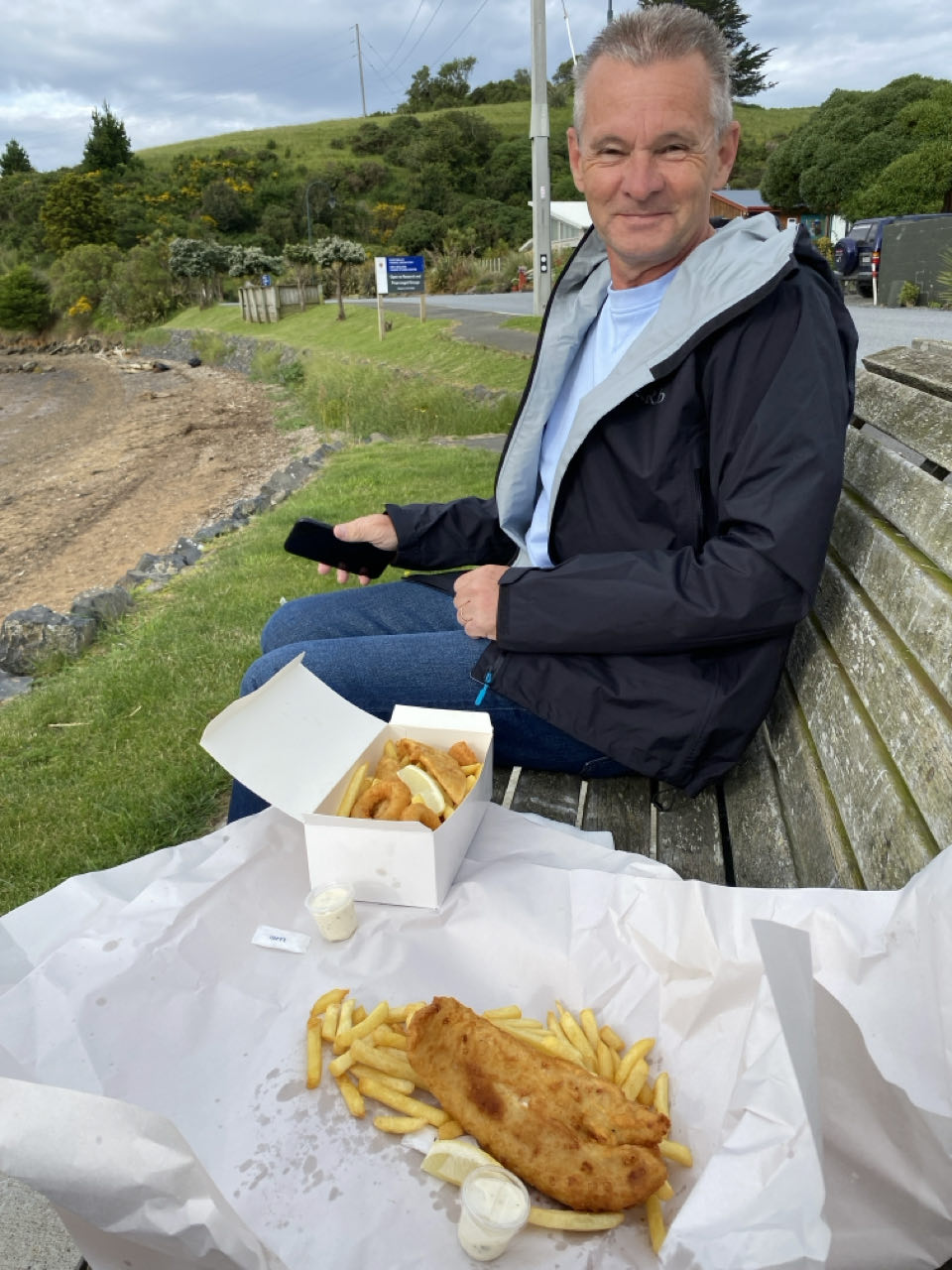 Daarna wandelden we door de stad. Gezellige stad met veel leuke zaakjes en ook oudere gebouwen. Vervolgens reden we door naar Portobello waar onze BenB ligt. Brenda vertelde dat de betere restaurants op dinsdag gesloten waren. Wel kon je fish and chips kopen tot half acht. Die werden gebakken door Wayne, haar man. We denken dat hij allerlei taken op zich heeft genomen om de kleine community van Portobello leefbaar te houden, want Wayne brengt soms ook de post rond terwijl ze allebei volgens ons de pensioengerechtigde leeftijd hebben. Vanmiddag kwamen ze rond vier uur terug van een fietstocht. Maar misschien hebben we gewoon teveel fantasie, dat kan ook nog.