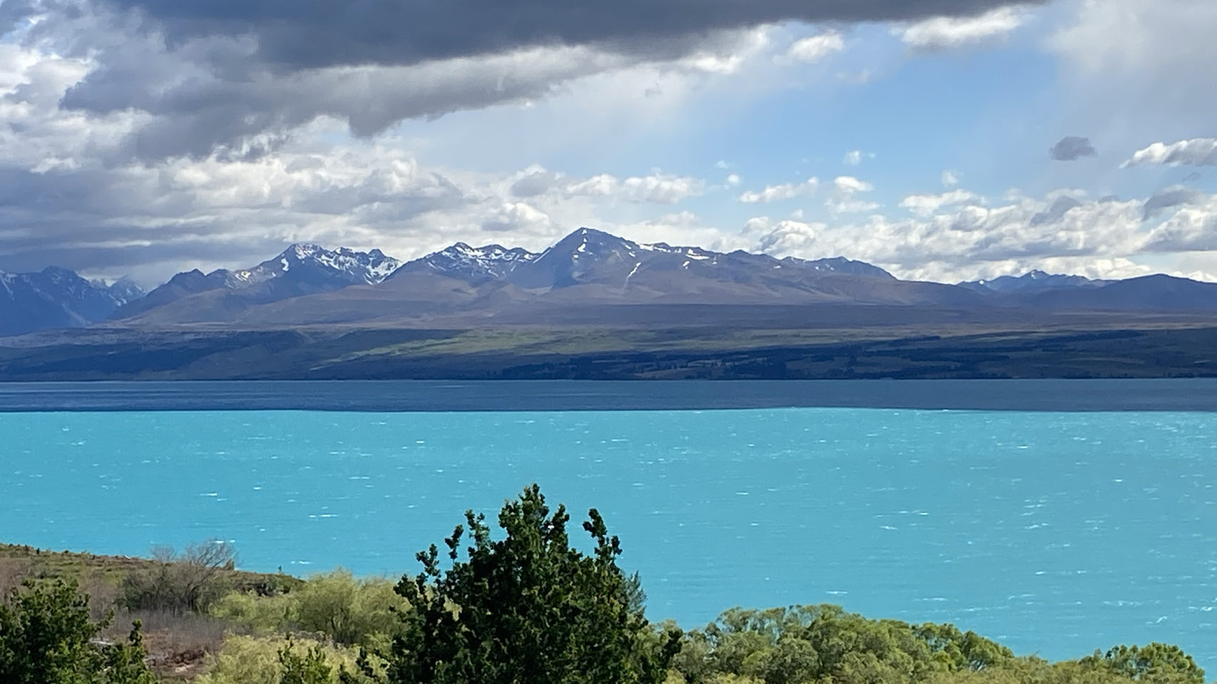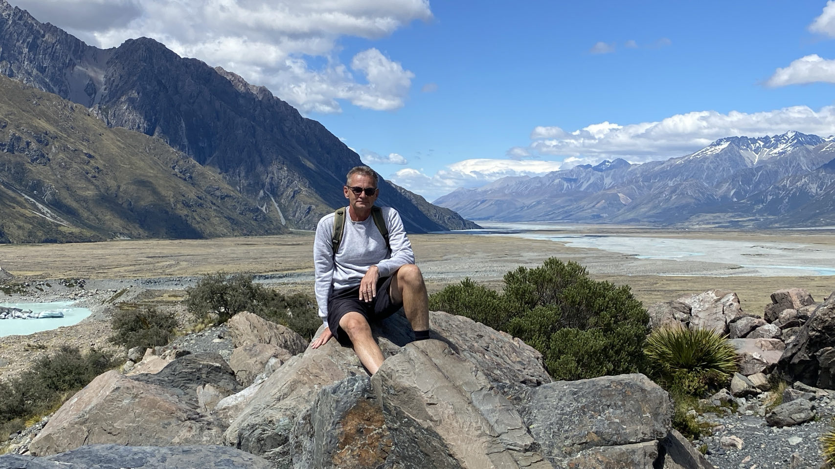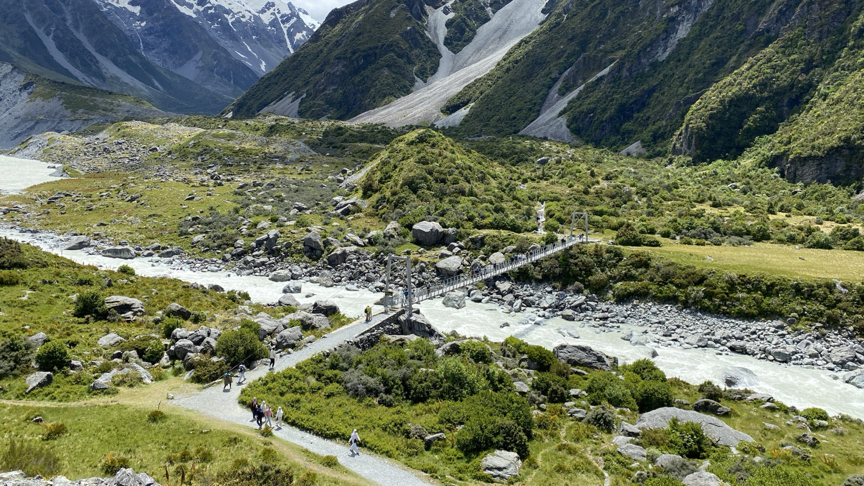 Daarna rijden we verder naar een berg met wel nog allerlei gletsjers. Op de achtergrond ligt Mount Cook, de hoogste berg van Nieuw-Zeeland. De top gehuld in de mist. Hier maken we ook een lange wandeling, onder andere over een schommelbrug. Terug komen we opnieuw langs Lake Pukaki, waar we mooie foto’s kunnen maken.