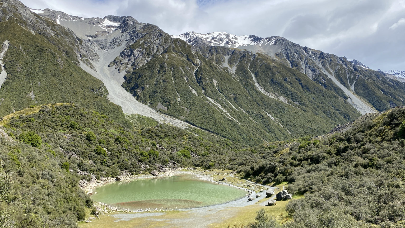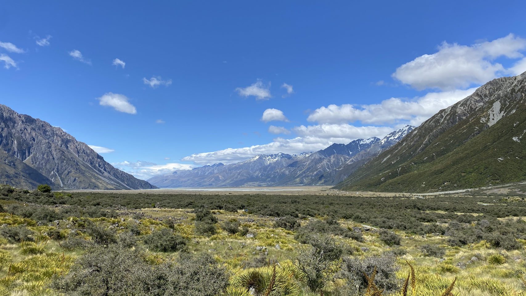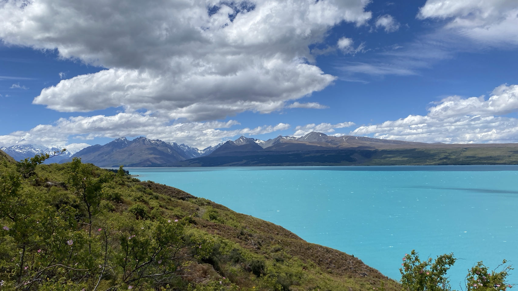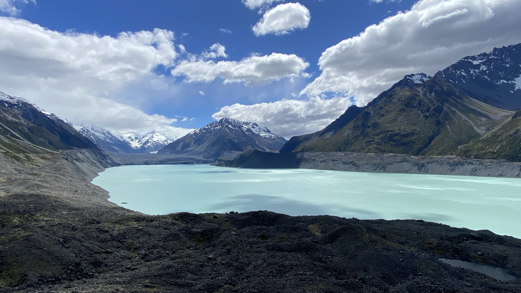 Daarna rijden we verder naar een berg met wel nog allerlei gletsjers. Op de achtergrond ligt Mount Cook, de hoogste berg van Nieuw-Zeeland. De top gehuld in de mist. Hier maken we ook een lange wandeling, onder andere over een schommelbrug. Terug komen we opnieuw langs Lake Pukaki, waar we mooie foto’s kunnen maken.