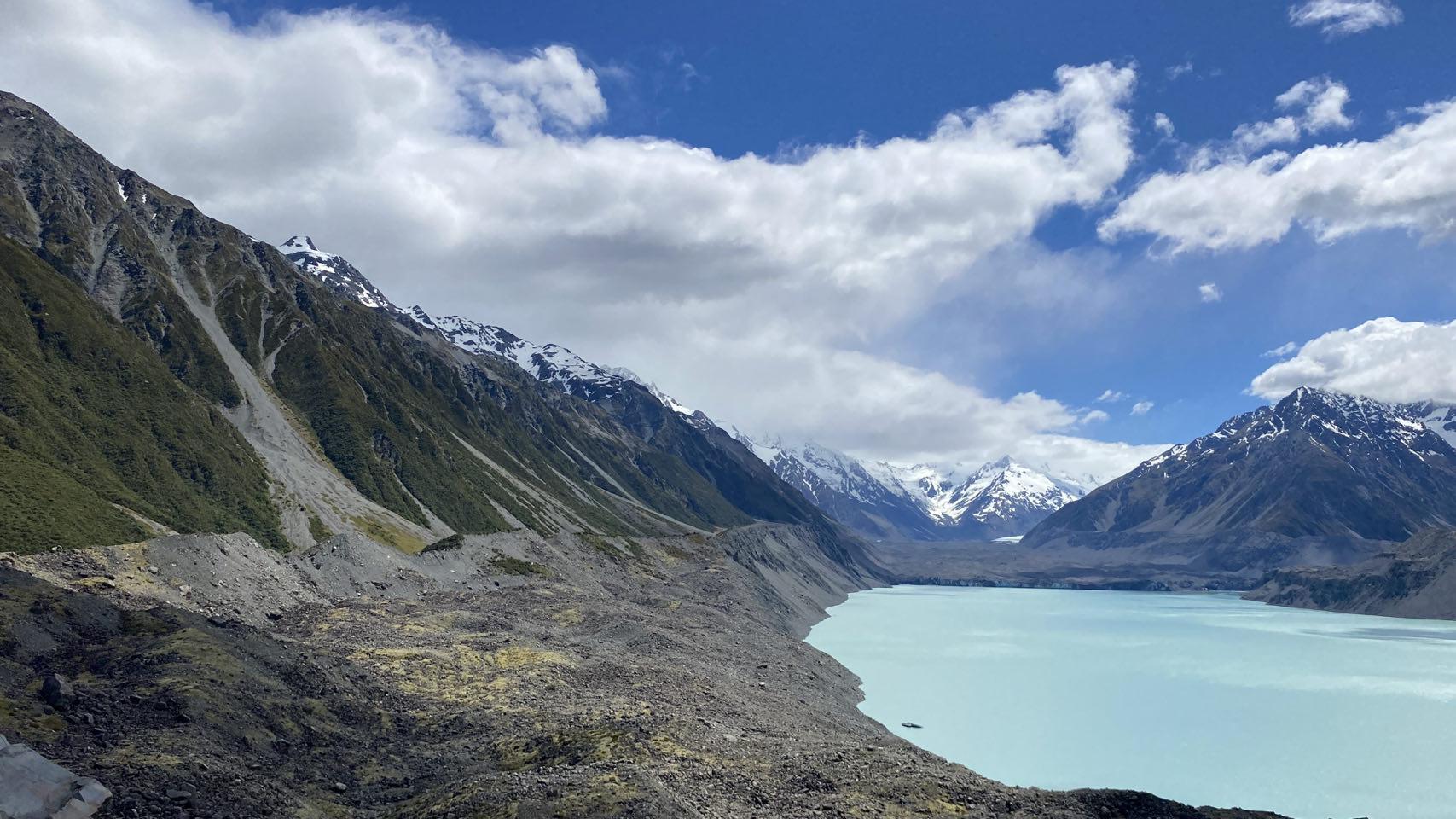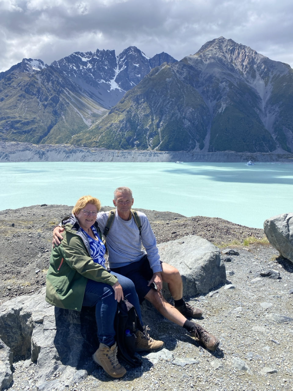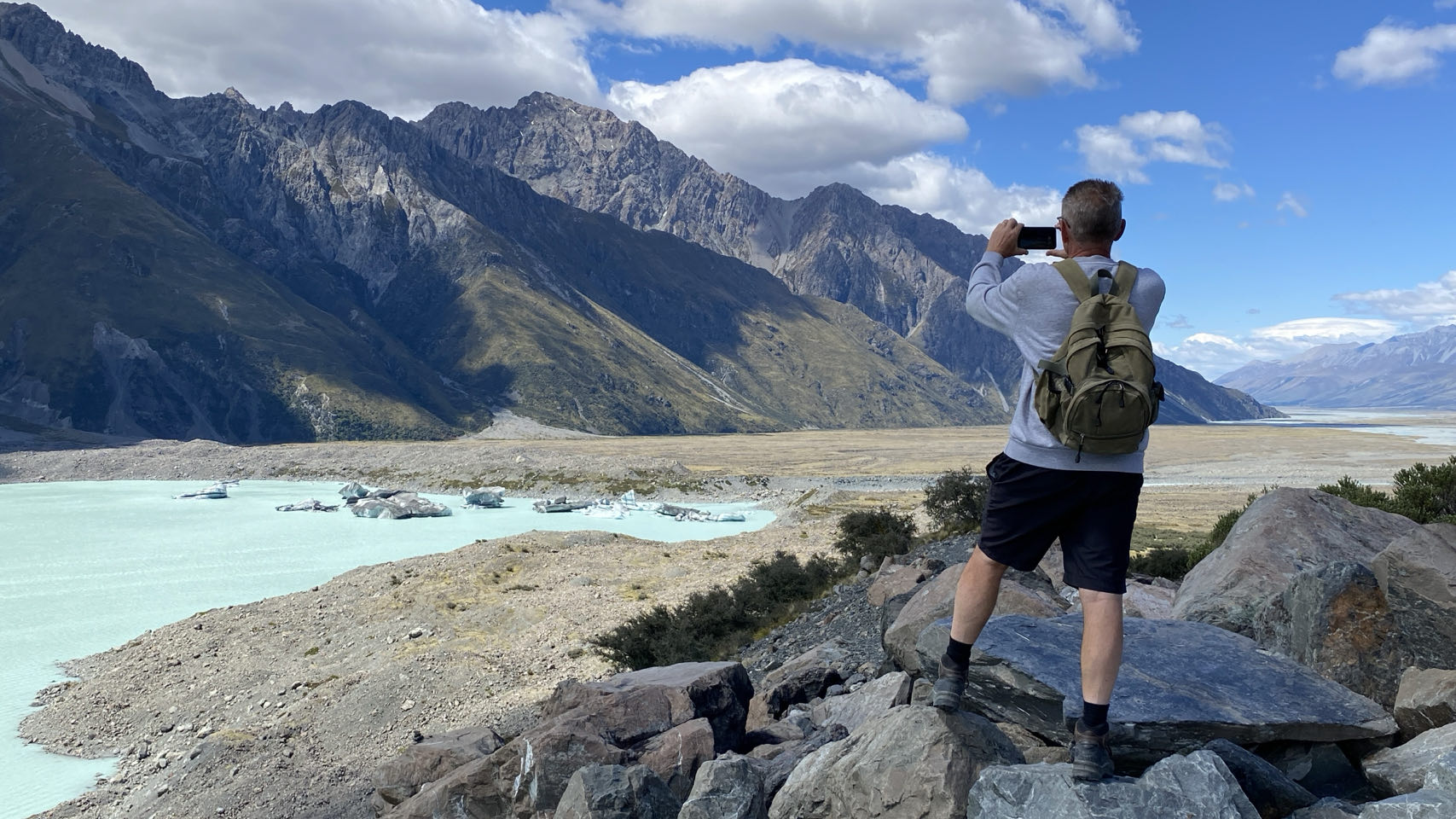 We rijden op vrijdagochtend zo’n 60 kilometer om te wandelen bij de bekende blue lakes. Die meren zijn echter inmiddels groen, het ijswater van de gletsjer, dat zorgt voor het blauw, bereikt de meren niet meer. Toch is het wel mooi, zeker helemaal bovenaan de route waar een ander groot meer ligt dat nog wel door de gletsjer gevuld wordt. Er liggen zelfs nog ijsschotsen in.